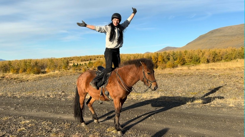 Sveifla ist eine 5-jährige braune Stute, die sorgfältig und liebevoll von einer deutschen Reiterin angeritten wurde – biomechanisch korrekt, brav und vertrauensvoll. Sie ist noch jung, aber schon super angenehm zu reiten, sehr artig und unkompliziert.